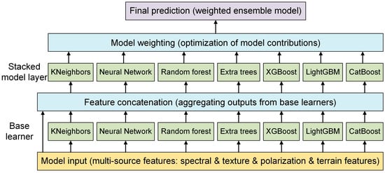 AutoGluon supports the automation of key tasks such as model construction, hyperparameter optimization, and model evaluation, demonstrating excellent performance in classification and regression tasks across various data types, including images, tables, and text []. It incorporates a range of algorithms, such as k-nearest neighbors [], random forests [], neural networks [], extremely randomized trees [], and three gradient-boosting decision tree algorithms (XGBoost [], LightGBM [], and CatBoost []). These models are commonly used machine learning methods for regression tasks and provide a strong baseline. Additionally, one of AutoGluon’s key features is the stacking ensemble model, which combines predictions from multiple base learners to create a meta-model that improves overall accuracy. In a two-layer stacking framework (Figure 5), the first layer consists of base models like random forests and neural networks, while the second layer uses the predictions from these base models as inputs to generate the final prediction. This stacking approach enhances predictive performance compared to individual models by combining the strengths of multiple algorithms. Each model captures different patterns and relationships within the data, and by aggregating their predictions, the stacking model reduces individual model biases and variance. This leads to more robust and accurate predictions, as the ensemble can balance the weaknesses of each single model while leveraging their strengths [,].