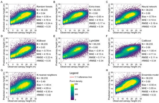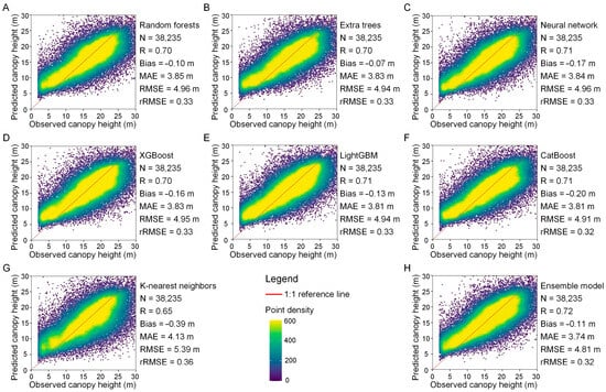Accuracy comparison of seven base models and the stacking ensemble model for canopy height inversion using ICESat-2 ATL08 data. (A) random forests, (B) extremely randomized trees, (C) neural networks, (D) XGBoost, (E) LightGBM, (F) CatBoost, (G) k-nearest neighbors, and (H) the stacking ensemble model.