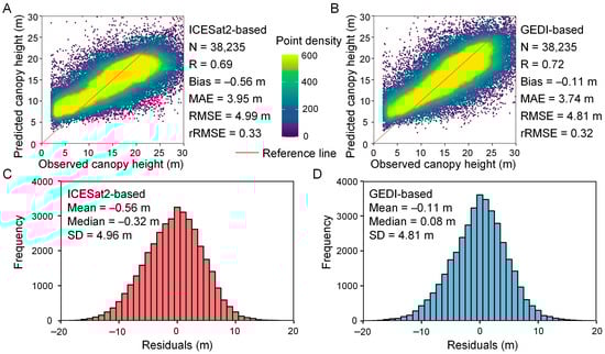 The residual distribution plots (Figure 8C,D) further highlight the difference in performance between the two models. The GEDI-based model shows a more symmetric residual distribution centered around zero, with a mean residual of −0.11 m, suggesting less systematic bias. In contrast, the ICESat-2-based model has a slightly larger mean residual of −0.56 m, indicating a tendency to underpredict canopy heights, particularly for taller canopies. Additionally, the standard deviation of residuals for the GEDI-based model (4.81 m) is slightly lower than that of the ICESat-2 model (4.96 m), reflecting a more consistent prediction across the dataset.