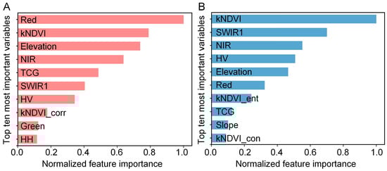 Top ten most important variables for canopy height prediction in stacking ensemble models based on (A) ICESat-2 and (B) GEDI data.