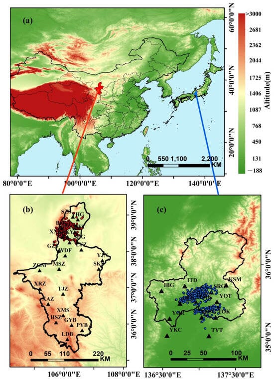 The layout of the observation sites. The geographical locations of the FALMAs, with the filled color indicating the altitude (a). The FALMAs deployed in Ningxia, China (b), and Gifu, Japan (c), with the black triangles representing the sites. The red and blue points indicate the analyzed PB initiations of inverted and normal IC flashes.