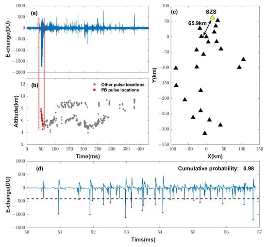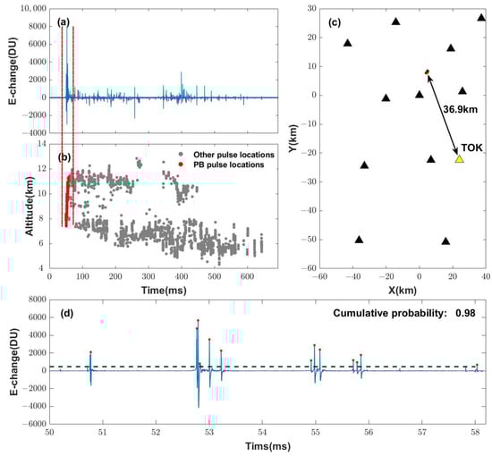 The expanded PB waveform is given in Figure 2d, which is recorded by the site TOK, as marked in Figure 2c. In this study, we use the same method as proposed in Shi et al. [] to distinguish the PB pulse. We first calculate the cumulative probability distribution of the pulse amplitude in each PB waveform. When the cumulative probability reaches 98%, the corresponding amplitude is determined to be the noise level. The pulses exceeding the noise level are identified as PB pulses, marked by red dots in Figure 2d. This method is consistently applied to inverted IC flashes, as depicted in Figure 3.