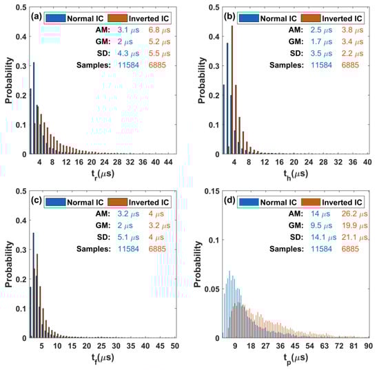 Figure 4 illustrates the probability distribution of pulse parameters, distinguishing between normal and inverted IC flashes with blue and red colors, respectively. For rise time, the maximum probability interval for normal IC flashes is between 1 and 2 μs (referred to as the interval [,] μs), while the maximum probability interval for inverted IC flashes falls within [,] μs. Correspondingly, the arithmetical mean (AM) rise times for normal and inverted IC flashes are 3.1 μs and 6.8 μs, indicating that inverted IC flashes generally exhibit longer PB pulse rise times.