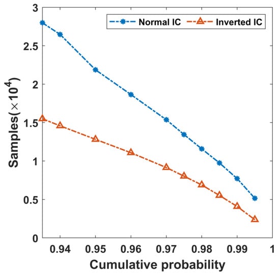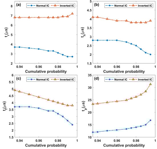 As outlined in Section 2, we have set the cumulative probability of 98% as a threshold value to identify PB pulses. Figure 5 gives the identified pulse number using various thresholds. It shows that the pulse sample size decreases with the increasing threshold. When the cumulative probability is set from 0.935 to 0.995, the identified PB pulses in normal/inverted IC flashes change from 27987/15497 to 5144/2366. This significant variance necessitates a separate analysis of pulse parameters under different thresholds, as depicted in Figure 6.