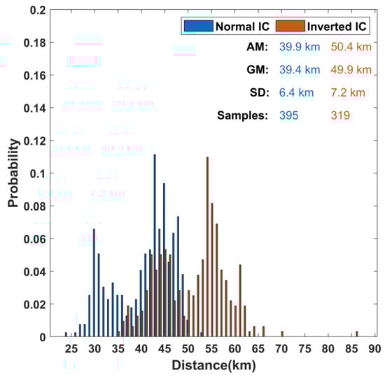 Figure 7 shows the distance between the PB location and the FALMA site. The AM distance for normal IC flashes is 39.9 km, which is smaller than the 50.4 km observed for inverted IC flashes. Considering the findings from Figure 7 and Figure 4, a hypothesis was naturally proposed that PB pulse parameters are dependent on distance.