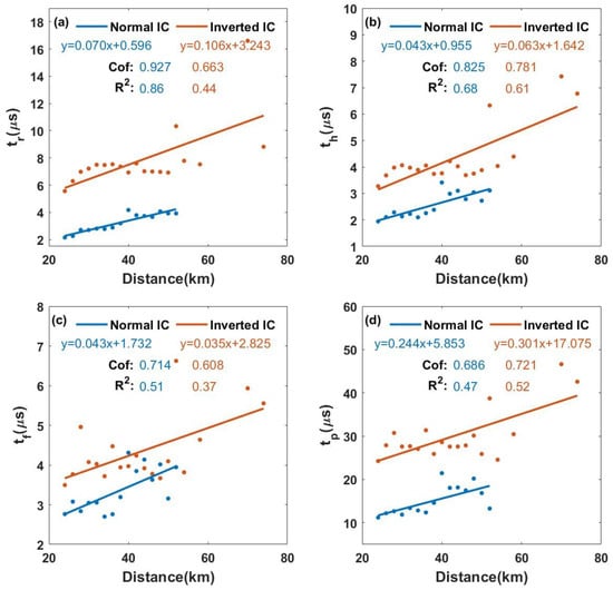 To examine this hypothesis, we analyzed the relationship between the parameters of PB pulses and their distance from the FALMA site. Figure 8 presents a scatter plot of the AM parameters against distance, with linear fits denoted by solid lines. Blue and orange dots individually represent the PB parameters of normal and inverted IC flashes. In Figure 8a, the rise time of PB pulses in normal (inverted) IC flashes increases by 0.6 (1.0) μs for every 10 km increment, with a correlation coefficient of 0.92 (0.66). The remaining three parameters in Figure 8b–d show the same dependence on distance. Such a dependence is similar to the findings on return strokes (Leal and Rakov []; Li et al. [], Shi et al. []). Therefore, it is concluded that the AM parameter values of all PB pulses in various ranges show a positive correlation with the propagation distance.