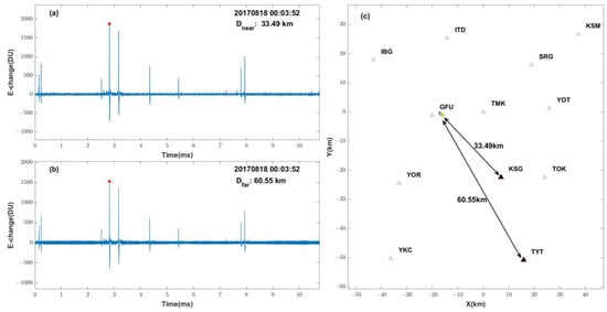 An example is provided in Figure 9. Figure 9a,b display the PB waveforms from the near (KSG) and far (TYT) FALMA sites, respectively. As shown in Figure 9c, the distances from the PB locations to the KSG and TYT sites are approximately 33.49 km and 60.55 km, respectively, defined as Dnear and Dfar. The largest PB pulses are marked with red dots. We calculated the ratio of Dnear to Dfar, as well as the ratio of the parameters of the largest pulses at the near sites to those at the far sites.