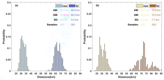 The statistics of the distances between the PB locations and the near/far FALMA sites. (a) Normal IC flashes; (b) inverted IC flashes.