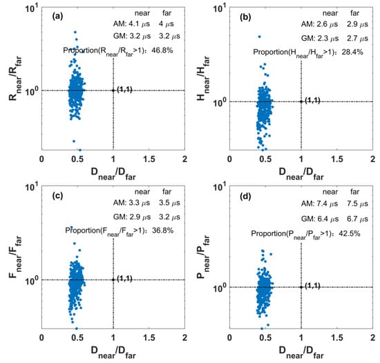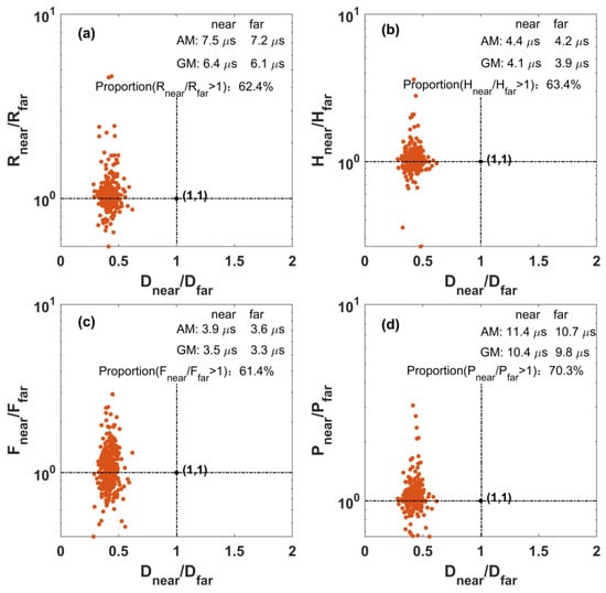 As stated in Section 4.1, the parameter of small-amplitude pulses that travel long propagation distances will be substantially influenced by background noise. To further examine the phenomenon in Figure 8 and mitigate the impact of inaccurate parameter statistics caused by small-amplitude pulses obscured by background noise, we have conducted a separate analysis. This analysis exclusively calculated the parameters of the largest PB pulses radiated by the same PB discharge event. PB pulse recordings were collected at both near and far FALMA sites, each at a distance larger than 10 km to ensure that the observed PB pulses predominantly reflect the radiation component without significant electrostatic or induction components (as defined by Uman et al. []).