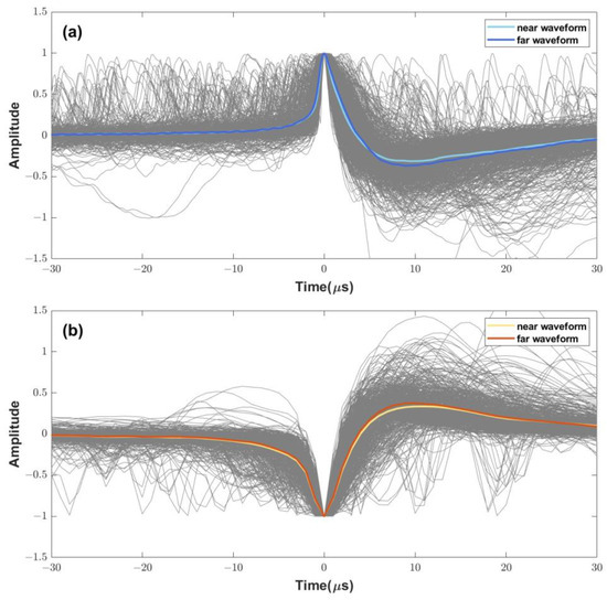 The average (color-coded lines) and individual (thin gray lines) amplitude-normalized PB pulse waveforms from near and far stations, shown on a time scale from −30 to 30 μs (where t = 0 corresponds to the peak of the largest PB pulse). (a) Normal IC flashes; (b) inverted IC flashes.