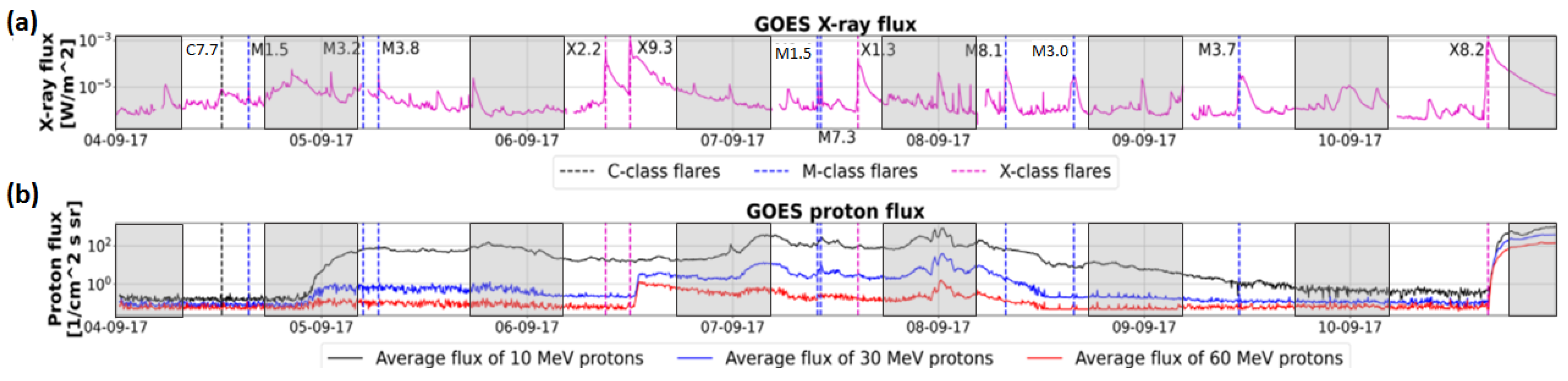 - Kolarski, A.; Veselinović, N.; Srećković, V.A.; Mijić, Z.; Savić, M.; Dragić, A. Impacts of extreme space weather events on september 6th, 2017 on ionosphere and primary cosmic rays. Remote Sens. 2023, 15, 1403. [Google Scholar] [CrossRef]