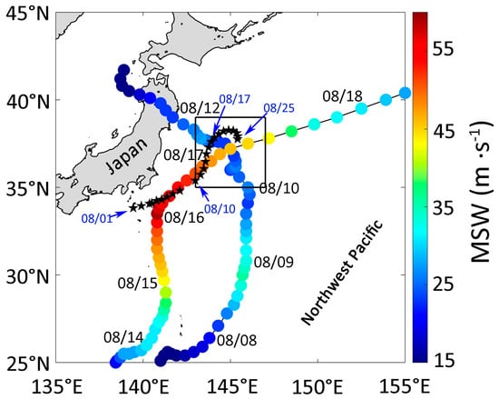 The trajectory and intensity changes in TC “MARIA” and TC “AMPIL” in the northwest Pacific (Figure 1) were sourced from the International Best Track Archive for Climate Stewardship (IBTrACS), which is managed by the National Centers for Environmental Information (NCEI) []. The dataset utilized in this study included 3-hourly movement speed and maximum sustained wind speed (MSW), as well as the longitude and latitude of the centers of these two typhoons (https://doi.org/10.25921/82ty-9e16, accessed on 25 September 2024). TC “MARIA” formed on 7 August 2024 in the northwest Pacific and passed through our study area during 10 to 11 August. After TC “MARIA” disappeared on 12 August, TC “AMPIL” appeared at the same time in the northwest Pacific and passed through our study area again on 17 August.