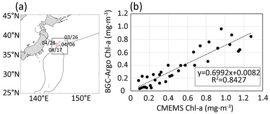 (a) The movement trajectory of the BGC-Argo float in our study area from 26 March 2024 to 28 April 2024. The red circle represents the movement trajectory of the BGC-Argo 2902878. Dates are given as “mm/dd”. (b) Scatter plots of BGC-Argo Chl-a and CMEMS Chl-a.