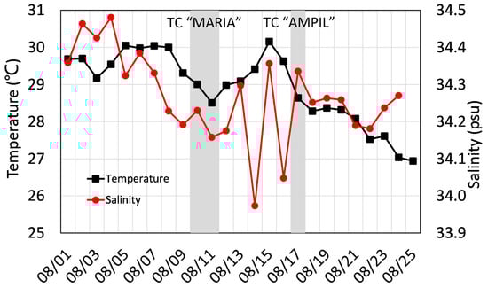 Time series of surface temperature and salinity based on Argo float 5906393 from 1 August to 25 August. Dates are given as “mm/dd”. The gray background represents the time when the typhoon passed through the study area.