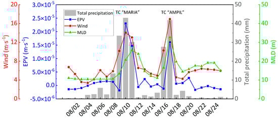The parameters such as wind, EPV, and MLD underwent drastic changes, reflecting the significant impact of the tropical cyclones on the marine environment during the passage of the TC “MARIA” and TC “AMPIL” (Figure 4). During the passage of TC “MARIA” from 10 to 11 August, the wind speed sharply increased, peaking at around 15 m·s−1. Subsequently, when TC “AMPIL” passed through on 17 August, the wind speed further escalated significantly, reaching a high of approximately 18 m·s−1. Outside of these tropical cyclone periods, the wind speed generally remained at a relatively lower level, fluctuating between 5 and 10 m·s−1. The mean translation speed of TC “MARIA” is 2.79 m·s−1, the mean MSW is 24.73 m·s−1, and the duration is 42 h (Table 1). In comparison, the mean translation speed of TC “AMPIL” is 5.05 m·s−1, the mean MSW is 47.59 m·s−1, and the duration is 18 h (Table 1). During the passage of TC “MARIA”, the EPV exhibited strong positive and negative fluctuations. Specifically, from 10 to 11 August, the EPV experienced significant variations, reaching a peak of approximately 2.3 × 10−5 m·s−1. When TC “AMPIL” passed through on 17 August, the EPV increased again, reaching a high value of around 1.5 × 10−5 m·s−1. In addition, minor changes in domain size (black box in Figure 1) do not affect the results. During both tropical cyclones, the MLD showed a significant increase, with depths reaching between 25 and 35 m. This deepening of the mixed layer highlights the extent to which the storm-induced mixing altered the stratification of the water column. After the passage of the typhoons, from 19 August to 25 August, the mixing in the study area remained strong, with depths measured at approximately 15 to 20 m. This sustained mixing indicates ongoing disturbances in the water column, even after the cyclones had moved on. Furthermore, there was a noticeable increase in total precipitation during the passage of both tropical cyclones. From 8 to 11 August, the total precipitation associated with TC “MARIA” reached approximately 120 mm. In comparison, during TC “AMPIL”, the total precipitation was around 70 mm. Heavy precipitation (apparently caused by AMPIL’s leading edge) started early, on 16 August (Figure 4), which is why the time when AMPIL passed on 17 August was significantly different from the time of the salinity decline on 16 August (Figure 3). This difference in rainfall amounts reflects the varying intensities and characteristics of the two storms, with TC “MARIA” exhibiting a more prolonged precipitation event.