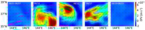The horizontal distribution of averaged EPV in the pre-typhoon period (1–7 August), the passage period of TC “MARIA” (10–11 August), the passage period of TC “AMPIL” (17 August), and the post-typhoon period (19–25 August). Dates are given as “mm/dd”. The black arrow represents the wind field.