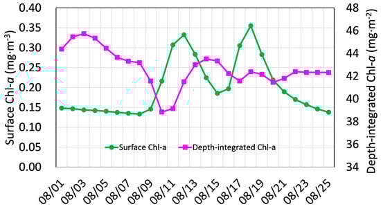 Surface Chl-a and depth-integrated Chl-a in August 2024. Dates are given as “mm/dd”.