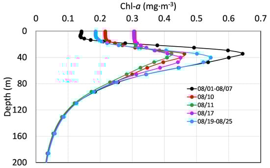 Vertical profile of Chl-a. 1–7 August represent the period before two typhoons, 08/10 and 08/11 represent the period during the TC “MARIA”, 08/17 represents the period during the TC “AMPIL”, and 19–25 August represent the period after two typhoons. Dates are given as “mm/dd”.
