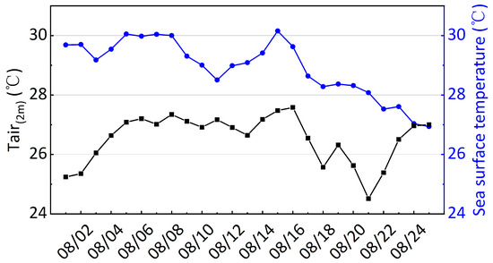 Air temperature at 2 m (Tair(2m)) and sea surface temperature in August 2024. Dates are given as “mm/dd”.
