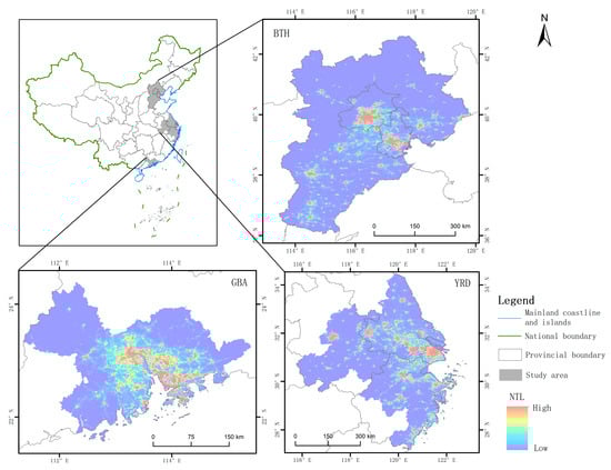 This study primarily focuses on three world-class urban agglomerations in China as the study areas, namely the Beijing–Tianjin–Hebei Urban Agglomeration (BTH), the Yangtze River Delta Urban Agglomeration (YRD), and the Guangdong–Hong Kong–Macao Greater Bay Area (GBA), as shown in Figure 1. The BTH is China’s “Capital Economic Circle”, representing the largest and most vibrant economic region in North China and serving as an important economic hub for the area. The BTH comprises 13 cities, with a total area of approximately 218,000 km2, a permanent resident population of approximately 110 million people (as of the end of 2022), and a regional gross domestic product exceeding RMB 10 trillion (in 2022). The YRD is an important intersection of the “Belt and Road” and the Yangtze River Economic Belt, and it is the most economically developed and most densely urbanized region in China with the highest concentration of towns [,]. The YRD includes 26 cities, with a total area of approximately 211,700 km2, a permanent resident population of approximately 240 million people (as of the end of 2022), and a regional gross domestic product reaching RMB 29.03 trillion (in 2022). The GBA is one of the most open and economically vibrant regions in China. The GBA comprises 11 cities, with a total area of approximately 55,900 km2, a permanent resident population of approximately 86.44 million people (as of the end of 2022), and a regional gross domestic product exceeding RMB 13 trillion (in 2022).