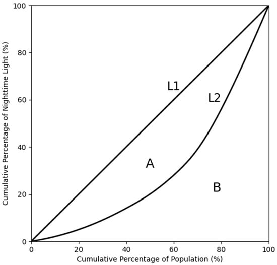 The calculation principle of the NLDI is similar to the Gini coefficient, with NTL intensity substituted for residents’ income to examine the disparity in the distribution of public services and population density, thereby understanding the degree of regional development inequality []. The value of the NLDI also ranges from 0 to 1, where a value closer to 0 indicates a higher degree of development equilibrium, and a value closer to 1 indicates a lower degree of development equilibrium. The specific calculation process is as follows: Obtain NTL data and population data with the same projection coordinates and spatial resolution, and extract the corresponding light intensity and population values for all grid cells within the region. Sort these values in ascending order based on light intensity. Subsequently, calculate the cumulative percentage of light and the cumulative percentage of population for the two datasets within the region, respectively, to plot the Lorenz curve. Finally, use the Lorenz curve to calculate the NLDI (Figure 2). The formula for calculating the NLDI is: