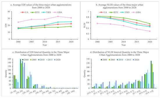 EDI and NLDI statistics of the three urban agglomerations from 2000 to 2020 ((a,b) UA represents the average value of the three urban agglomerations, (c,d) Distribution of EDI and NLDI Interval Quantity in the three urban agglomerations from 2000 to 2020).