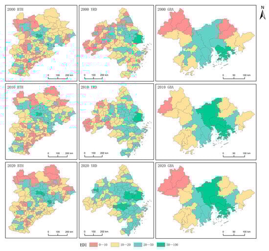 Spatial distribution of EDI of three urban agglomerations from 2000 to 2020.