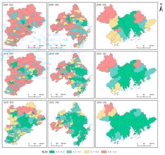 Spatial distribution of NLDI of three urban agglomerations from 2000 to 2020.
