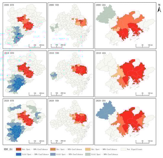EDI hotspot maps of three major urban agglomerations from 2000 to 2020.