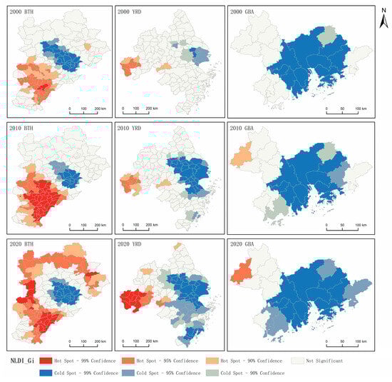 NLDI hotspot maps of three major urban agglomerations from 2000 to 2020.