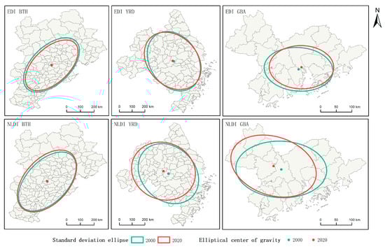 From 2000 to 2020, the economic vitality and development equilibrium of the YRD basically exhibited a spatial distribution pattern in the northwest–southeast direction. For EDI, the shape of the ellipse in the southeast direction changed little, while there was a trend of expansion in the ellipse range in the northwest direction. The centroid of the ellipse also shifted slightly towards the northwest, aligning with the offset trend of the ellipse boundaries. This suggests that the economic growth momentum in the northwestern region of the YRD was slightly stronger from 2000 to 2020, with accelerated growth in economic quality and development potential. For NLDI, there was a trend of reduction in the ellipse range in the southeast direction, while there was a trend of expansion in the ellipse range in the northwest direction. Additionally, the centroid of the ellipse also shifted slightly towards the northwest. This indicates that the development in the southeastern region of the YRD gradually became more balanced from 2000 to 2020, while the development in the northwestern region gradually became more unbalanced. Furthermore, the distribution range of the SDE for EDI increased from 127,152 km2 in 2000 to 130,464 km2 in 2020, with a gradual expansion in the spatial distribution range. This indicates that the economic quality and development potential of marginal areas increased. However, the distribution range of the SDE for NLDI also increased from 147,094 km2 in 2000 to 152,822 km2 in 2020, with a gradual expansion in the spatial distribution range. This suggests that although the economic level in marginal areas increased, the balance of development worsened.