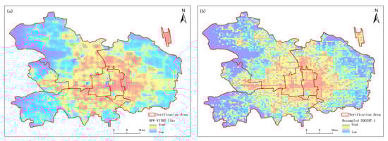The calculation formulas for the indicators can be referred to in Section 3.1. Among them, the NEVI requires special explanation. In the process of constructing the NEVI, we select the ratio of the sum of NTL brightness values greater than 7 within a region to the total brightness values of NTL within the same region to represent the intensity of NTL expansion vitality in that region. Given that the selection of this pixel value threshold is based on relevant research by Liu et al. [], it is important to note that the NTL data used in their study was from SDGSAT-1, whereas in our study, we utilized NPP-VIIRS-like NTL data. To assess the validity and applicability of the chosen pixel threshold, we first selected Beijing’s main urban area as a validation region and used 2020 data as an example. We resampled the SDGSAT-1 data to match the resolution of the NPP-VIIRS-like data. Then, we extracted the pixel values from both SDGSAT-1 and NPP-VIIRS-like NTL data within the validation area. By conducting a Pearson correlation analysis to examine the degree of correlation between the two datasets, we found that the R2 value was 0.782, and the correlation was significant at the 0.01 level (two-tailed). This indicates that the SDGSAT-1 and NPP-VIIRS-like data exhibit a high degree of correlation. Furthermore, we visualized the SDGSAT-1 and NPP-VIIRS-like data within the validation area using the same stretching method and color band for comparison. As shown in Figure 9, the spatial distribution patterns of the resampled SDGSAT-1 and NPP-VIIRS-like data exhibit a high degree of consistency overall. Since Figure 9b is derived from the more refined (40 m resolution) SDGSAT-1 data after resampling, the NPP-VIIRS-like data appear smoother in comparison. This observation supports the applicability of the chosen pixel threshold to both SDGSAT-1 and NPP-VIIRS-like data.