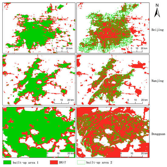 The choice of 7 as the boundary value between regions with strong and weak economic vitality is based on the observation that areas with high levels of urbanization tend to have relatively high intensities of economic activity, and the potential for expansion into surrounding regions is higher than in areas with low levels of urbanization. By using this threshold, we aim to distinguish between regions with high and low expansion potential. A larger proportion of regions with high expansion potential indicates a higher likelihood of expansion into surrounding regions. Given that the degree of urbanization can be measured to some extent by the extent of urban built-up areas, we validated the effectiveness of the threshold value of 7 by taking the year 2020 as an example. We reclassified the NPP-VIIRS-like imagery data into two categories: pixel values greater than 7 (indicating high economic vitality) and pixel values less than or equal to 7. We then compared the high economic vitality regions (with pixel values > 7) with two publicly available datasets: the Dataset of Urban Built-up Area in China [] and A Dataset of Built-up Areas of Chinese Cities in 2020 []. To distinguish between the two datasets, we named the first one “built-up area1” and the second one “built-up area2.” For validation, we selected Beijing in BTH, Nanjing in YRD region, and Dongguan in GBA as the validation areas. As illustrated in Figure 10, the high economic vitality regions in the three validation areas show a high degree of spatial consistency with the urban built-up areas recorded in both datasets. This indicates that the threshold value of 7 is applicable across different regions. Therefore, selecting 7 as the pixel threshold is both effective and applicable. Furthermore, the construction of the NEVI is reasonable.