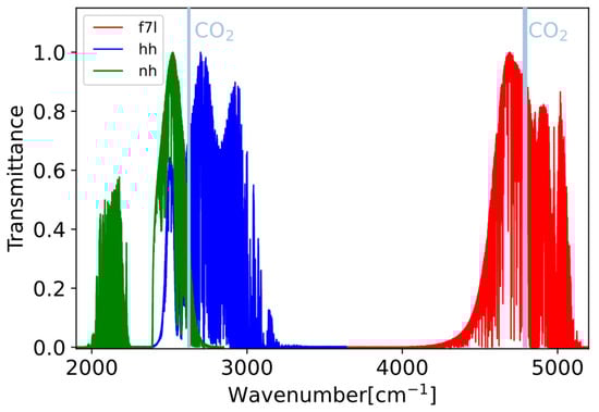 Two observation modes are used alternately to acquire FTIR spectra at Xianghe. TCCON mode records SWIR spectra, and uses GGG2020 code to retrieve XCO2. The SWIR spectra are acquired by the FTIR with an indium gallium arsenide (InGaAs) detector, which covers the spectral range from 3800 to 10,000 cm−1, with a spectral resolution of 0.02 cm−1. The NDACC mode records mid-infrared (MIR) spectra, and uses SFIT4 code to retrieve both the vertical profile and total column of CO2. The MIR spectra are recorded with a liquid-nitrogen-cooled indium antimonide (InSb) detector, which covers the spectral range from 1800 to 5400 cm−1, with a spectral resolution of 0.0035–0.0078 cm−1 []. In addition, NDACC mode uses several optical filters in front of the InSb detector to improve the signal-to-noise ratio (SNR) of the spectra (Appendix A in Blumenstock et al. []). Each optical filter obtains a type of spectrum with a specific wavenumber range. As the CO2 absorption lines are mainly located near 2600 cm−1 and 4800 cm−1 [,], three types of spectra are looked into in this study, namely nh, hh, and f7l (Figure 1). Both nh and hh spectra cover the CO2 lines near 2600 cm−1, and f7l covers the CO2 lines near 4800 cm−1.