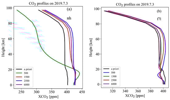 The Tikhonov regularization is used to construct () [], where α values are chosen depending on the root mean square error (RMSE), DOF, and the CO2 profile from the retrieval []. Several α values were tested with the spectra on 3 July 2019, as this was a day with a relatively large number (9 for nh and 10 for f7l) and high quality of spectra. The results for NDACC-type (2600 cm−1) and NDACC-type (4800 cm−1) retrievals are listed in Table 2, and the a priori and retrieved CO2 vertical profiles are shown in Figure 2. It is noted that we use the same parameter settings for nh and hh type spectra (2600 cm−1), and the retrieved results shown in Figure 2 are the nh type spectra. For NDACC-type (2600 cm−1) retrievals, the CO2 vertical profile exhibits significant anomalies with α = 500. The RMSE with α = 1500 is almost the same as those with α = 2500 and α = 6000, but the DOF is greater. For NDACC-type (4800 cm−1) retrievals, the XCO2 value with α = 2500 is similar to that with α = 6000 and provides the lowest mean RMSE value. Finally, the α near the 2600 cm−1 and 4800 cm−1 bands are set to 1500 and 2500, respectively.