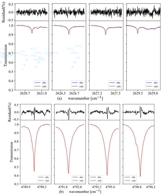 The spectroscopic parameters are key elements in the remote sensing field. Here, several spectroscopic databases have been tested in Section 3.1.1. The retrieval micro-windows are rather important, too. Generally, retrieval windows are taken where the target gas absorption is significant but not saturated and where interference from other gases is minimized []. In the MIR spectral range, there are many other interfering gases with strong absorption. According to the HITRAN2020 database, as well as previous studies, micro-windows near 2600 cm−1 and 4800 cm−1 are selected separately. The interfering gases simultaneously retrieved in each band are given in Table 1 [,,]. Figure 3 shows two typical spectra near 2600 cm−1 collected at 01:57 UTC on 16 April 2019 with a solar zenith angle (SZA) of 48.67° and near 4800 cm−1 collected at 01:26 UTC on 16 April 2019 with a SZA of 43.35°, respectively. The fitting residuals of all windows are within ±0.5%, and the two RMSE values are 0.116% and 0.111%, indicating that we obtained good fits in both spectral regions.