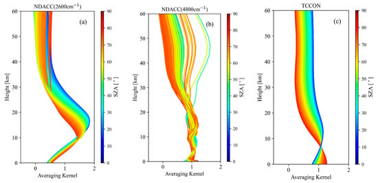 According to the optimal estimation method (OEM) [], the trace of is the signal degree of freedom (DOF). When the DOF of the target gas within a vertical range is greater than 1, this indicates that the corresponding total column can be separated into independent partial columns [,]. Vertical information on CO2 can be obtained in our NDACC retrievals, and here the DOF is about 2.0 for the NDACC-type (2600 cm−1) CO2 retrievals and about 2.6 for the NDACC-type (4800 cm−1) CO2 retrievals.