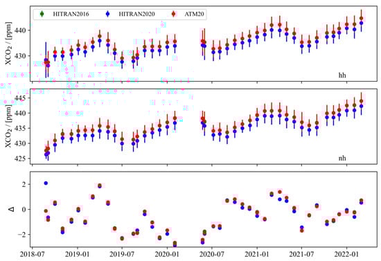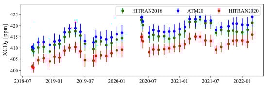 Time series of monthly mean retrieved XCO2 from f7l type spectra with HITRAN2016, ATM18, and HITRAN2020, respectively.