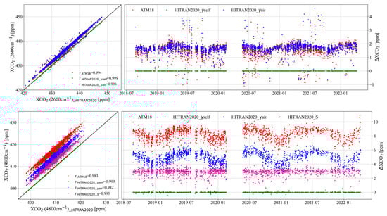 The correlations (left) and the time series of differences from August 2018 to April 2022 (right) between the retrieved XCO2 using different spectroscopies (ATM18; HITRAN2020_ γself; HITRAN2020_ γair; and HITRAN2020_ S) and unchanged HITRAN2020 in 2600 cm−1 (upper) and 4800 cm−1 (bottom) bands. Note that the line intensity (S) at the corresponding positions in ATM18 and HITRAN2020 are the same in the 2600 cm−1 band so that only the parameters γair (blue) and γself (green) are shown here. “r” is the correlation coefficient between the retrieved XCO2 using unchanged HITRAN2020 and spectroscopy shown in subscript.
