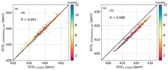 The correlations between retrieved XCO2 using HITRAN2020 after changing γair and ATM18 in 2600 cm−1 (a) and 4800 cm−1 (b). The correlation dots are colored with their measurement months. The red dashed line is the linear regression curve. R is the correlation coefficient.