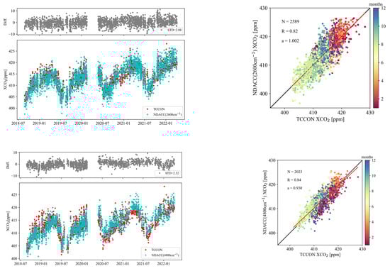 The XCO2 time series of NDACC-type (2600 cm−1), NDACC-type (4800 cm−1), and TCCON XCO2 measurements between August 2018 and April 2022, together with their differences and correlations, are shown in Figure 9. The a priori substitution and smoothing correction were applied to NDACC retrievals (see Section 2.4.1). Since TCCON has been scaled to the WMO standard, we applied the correction to remove the systematic bias of NDACC retrievals, with values of 18.45 ppm for NDACC-type (2600 cm−1) and 7.07 ppm for NDACC-type (4800 cm−1). The seasonal variations of XCO2 derived from NDACC-type (2600 cm−1), NDACC-type (4800 cm−1), and TCCON have a similar pattern with a maximum in spring and a minimum in summer. There is a good correlation between NDACC and TCCON XCO2 measurements, and the R between NDACC-type (4800 cm−1) and TCCON of 0.84 is similar to that between NDACC-type (2600 cm−1) and TCCON with R of 0.82. The STD of the XCO2 difference is 2.88 ppm between TCCON and NDACC-type (2600 cm−1) and 2.32 ppm between TCCON and NDACC-type (4800 cm−1). The scatter of the NDACC-type (4800 cm−1) retrievals is less than that of the NDACC-type (2600 cm−1) retrievals.