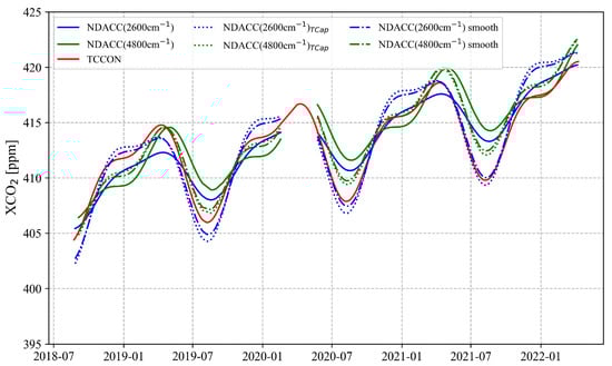Figure 10 shows that there is a large distinction in the shape of the fitted curves between original NDACC measurements and TCCON and the correlation between them is relatively weak, with R values of 0.75 and 0.73 for NDACC-type (2600 cm−1) and NDACC-type (4800 cm−1), respectively. The amplitude of the XCO2 seasonal variation in NDACC retrievals with the fixed a priori profile from WACCM is lesser than that in NDACC retrievals using the same a priori profile as TCCON, especially for the NDACC-type (2600 cm−1) measurements. On the scale of seasons, the changes in the CO2 profile are mainly reflected in the shape, where the changes in the lower and middle troposphere dominate []. This demonstrates the difficulty of using the NDACC-type (2600 cm−1) retrieved XCO2 to capture the whole seasonal variation due to its low sensitivity (Figure 4a) [,].