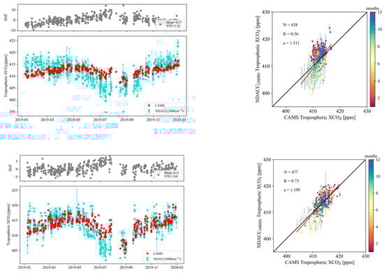 As the change of CO2 mainly occurs in the lower troposphere [], the tropospheric CO2 partial column can better capture the signal of the emissions and sinks than the total column []. The time series of tropospheric XCO2 between February 2019 and February 2020 from NDACC retrievals and CAMS re-analysis products, together with their differences and correlations, are shown in Figure 11. To remove the systematic bias in NDACC retrievals, the corrections of 19.36 ppm for NDACC-type (2600 cm−1) and 5.46 ppm for NDACC-type (4800 cm−1) were applied using TCCON as a standard. The CAMS XCO2 was smoothed by NDACC AVK (see Section 2.4.2). Similarly to the CO2 total column, the time series of tropospheric XCO2 has a significant seasonal variation, with the maximum in spring and the minimum value in summer. The tropospheric XCO2 from the CAMS model is 0.27 ± 3.52 ppm lower than that from NDACC-type (2600 cm−1) retrievals, and the R is 0.56. The tropospheric XCO2 from CAMS is 0.21 ± 2.60 ppm higher than that from NDACC-type (4800 cm−1) retrievals, and the R is 0.73. It is indicated that the NDACC-type (4800 cm−1) retrievals have a better agreement with the CAMS model in the troposphere than the NDACC-type (2600 cm−1) retrievals (R = 0.56). This is not surprising, as the AVK of the NDACC-type (4800 cm−1) retrieval shows a good sensitivity in the troposphere. It can be found that the CAMS reanalysis data show an underestimation of the seasonal amplitude of tropospheric XCO2 compared to those from both NDACC retrievals. The incomplete spatial matching between the CAMS model (regional mean) and FTIR observation (one site), as well as the uncertainty of the CAMS model, may cause this difference [].