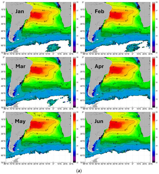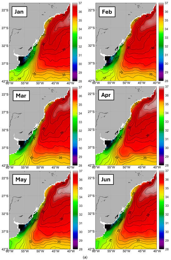 (a) Long-term (2011–2019) mean monthly SSS in the Rio de la Plata outflow region, January–June. (b) Long-term (2011–2019) mean monthly SSS in the Rio de la Plata outflow region, July–December.