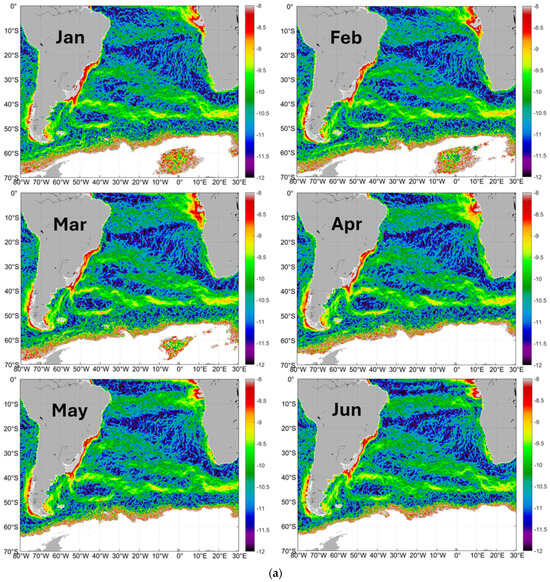 (a) Log-transformed gradient magnitude GM of sea surface salinity SSS, January–June. (b) Log-transformed gradient magnitude GM of sea surface salinity SSS, July–December.