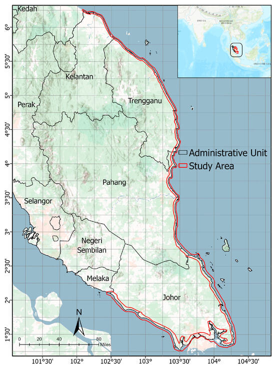 This study focuses on the coastal belt of Peninsular Malaysia, specifically targeting the eastern coasts of Kelantan, Terengganu, and Pahang and both the eastern and western coasts of Johor (Figure 1). This region represents a diverse and dynamic stretch of Malaysia’s shoreline, encompassing a range of geomorphological, ecological, and socio-economic environments. Sand beaches, river estuaries, and patches of mangrove forests are the main features of Peninsular Malaysia’s east coast, which includes Kelantan, Terengganu, and Pahang. These states face the South China Sea and are known for their monsoon-influenced climate, which brings intense wave action, particularly between November and March [,]. The extensive development and expansions of the urban areas of Kuala Terengganu and others have also led to shoreline recession, and areas such as Pantai Tok Jembal and Pantai Chendering have been experiencing over 5 m/year of erosion []. The region is also part of the East Coast Economic Region (ECER), a significant economic corridor focused on tourism, manufacturing, agriculture, and logistics, spread over 66,000 square kilometers and supporting a population of over 3.9 million []. The Johor province, on the other hand, has coastlines along the South China Sea (east) and the Strait of Malacca (west). The eastern shore experiences seasonal wave action and storm surges due to the Northeast Monsoon, while the western shore is relatively more stable owing to its protected geomorphology. However, in some of the areas along Tanjung Piai and Pulau Indah, it has been increasingly noted to have suffered from ship activities and coastal extensions of the ports, resulting in sediment disruption and mangrove destruction [,].
