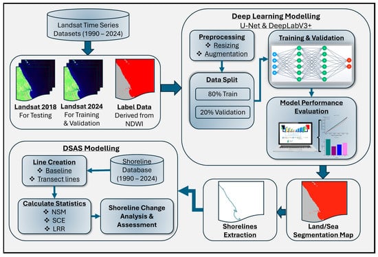 Each Landsat scene contains six critical spectral bands, which include visible, near-infrared, and short-wave infrared wavelengths because these bands effectively distinguish land–water borders and shoreline features. The Level 2 surface reflectance data is utilized, which is pre-processed with atmospheric correction to minimize radiometric inconsistencies across the time series. Deep learning models (U-Net and DeepLabV3+) underwent training and development using the 2024 composite image before applying them to the 2018 image as the main testing data. After model evaluation, the best-performing model proceeded to extract shorelines across all selected years for conducting detailed shoreline change analysis. The overall methodology framework is shown in Figure 2.