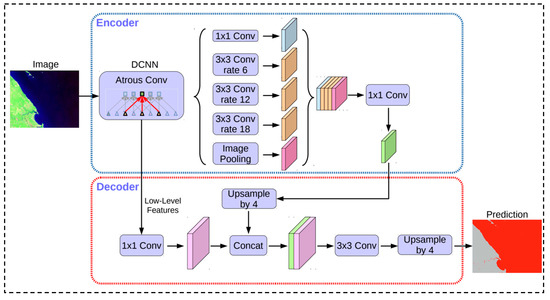 DeepLabV3+ architecture for Land/Sea Segmentation of Landsat Images. Source: [,]. The figure illustrates the encoder-decoder structure, where the blue region represents the encoder with various convolution operations: 1 × 1 convolution (purple), 3 × 3 convolutions with different dilation rates (orange, pink, and beige), and image pooling. The arrows in the encoder section depict the flow of data through these layers. The red region represents the decoder, with low-level features being upsampled by a factor of 4, followed by 1 × 1 convolution and concatenation. The arrows in the decoder section indicate the progression of features from the encoder to the final upsampled prediction output. The green and pink blocks show the upsampling operations and concatenation process respectively. The final output is a Land/Sea segmentation prediction, shown on the right side.