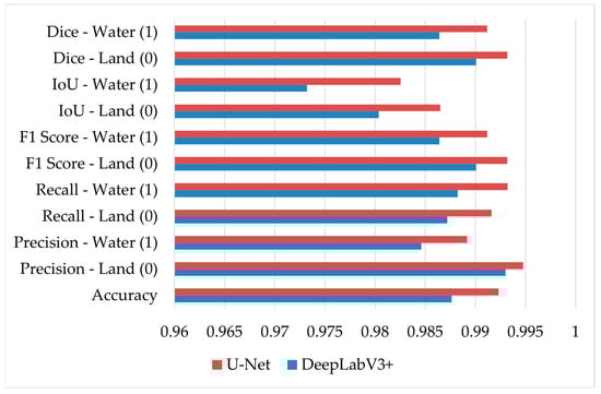 Subsequently, both models were tested on the independent 2018 Landsat image (Figure 6). Evaluation metrics, including precision, recall, F1 score, accuracy, and IoU, were computed for both land and water classes. Results (Figure 6) showed very slight differences in favor of U-Net across all metrics, reaffirming its marginally better generalization capability in the test scenario.