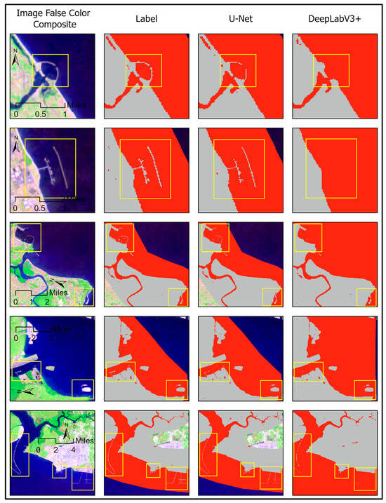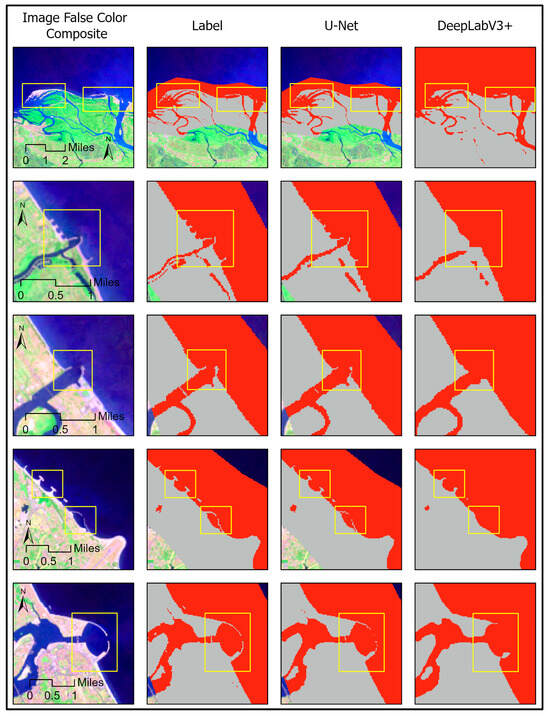 Although the numerical metrics showed very close performance, these indicators alone may not be sufficient to demonstrate the differences between these models. To visually demonstrate the effects of the models, Figure 7 and Figure 8 display the visual inspection of classification results across varied coastal areas. To facilitate observation, the parts with significant differences are marked with rectangular boxes. Although the mIoU of each model is above 97%, there are still significant differences in the actual segmentation results of land and sea. U-Net’s segmentation results displayed more detailed and sharper shoreline boundaries than DeepLabV3+. In regions with intricate shoreline boundaries, such as narrow inlets, estuaries, groynes, and breakwaters, the U-Net model consistently preserved finer geometric details. It effectively maintained spatial fidelity, minimizing edge smoothing and segmentation fragmentation. In contrast, DeepLabV3+, while generally consistent, showed some smoothing effects around curved and narrow shoreline sections, leading to a slight loss of fine-scale features. Moreover, in sediment-heavy or turbid water zones, U-Net exhibited more consistent water delineation, avoiding the overprediction observed in DeepLabV3+. Such visual differences, though subtle, are crucial when classifying shoreline boundaries from medium-resolution sensors like Landsat, where edge precision plays a pivotal role in subsequent spatial analyses, such as DSAS-based shoreline change detection.